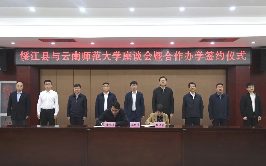 绥江县副县长唐梅、云南师范大学基础教育集团办公室主任王玉光代表双方签署协议。